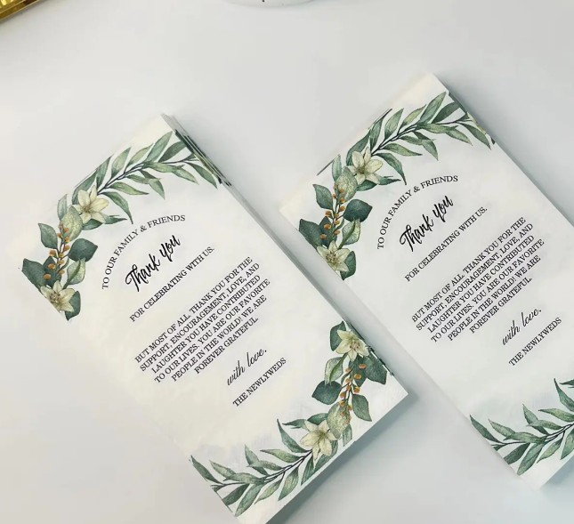 Dla klientów korporacyjnych chcących wzmocnić wizerunek swojej marki, spersonalizowane     serwetki papierowe z nadrukiem imprezowym    są niezwykle opłacalnym narzędziem komunikacji marki. Chusteczka z nadrukiem z logo lub hasłem Twojej firmy zapewnia gościom krótką, ale skuteczną ekspozycję marki. Jest to bardziej praktyczne i dostępne niż drogie prezenty, co czyni go doskonałą strategią marketingową wydarzeń.